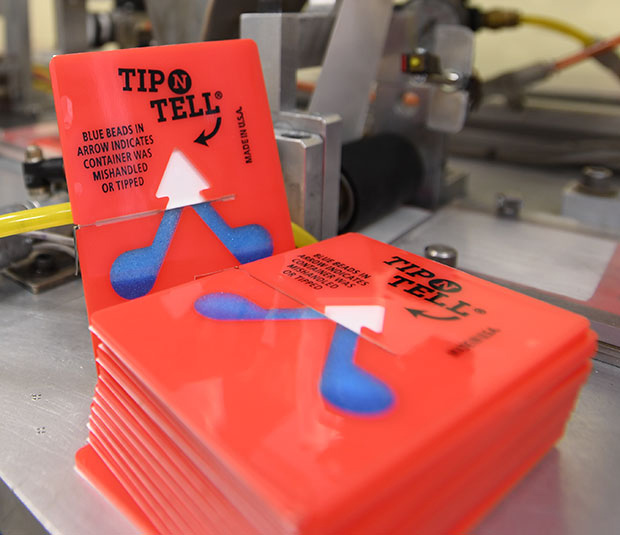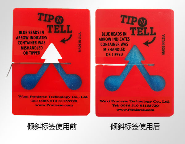 美國生產商制造的TIP N TELL產品,中文名為防傾貼標簽(以下簡稱),別名為傾斜標貼、傾斜顯示貼、傾斜感知器、防傾斜顯示器等。