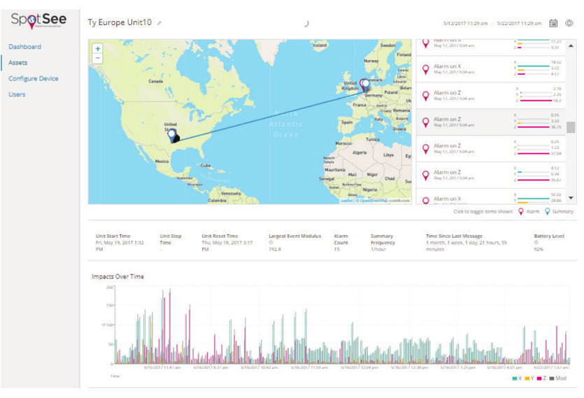 ShockLog 298監測撞擊事件、振動、并提供內部溫度峰值(時段)和總結詳細的行程數據。